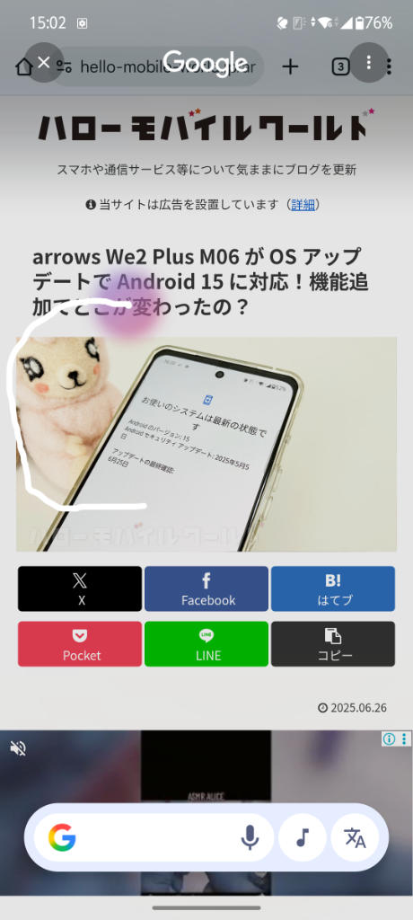 その記事で arrows We2 Plus M06 を Android 15 にアップデートし、Google の囲って検索(以下「かこって検索」)機能も使えるようになったことを実際に試しています。